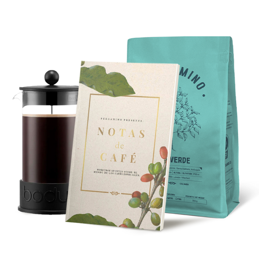 Kit Pergamino 360g + Prensa francesa Bodum Brazil + Libro Notas de Café