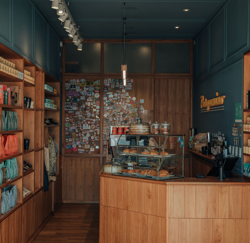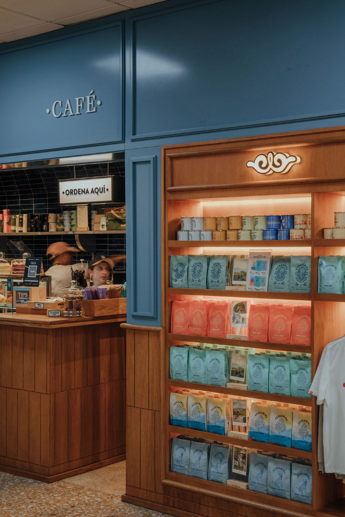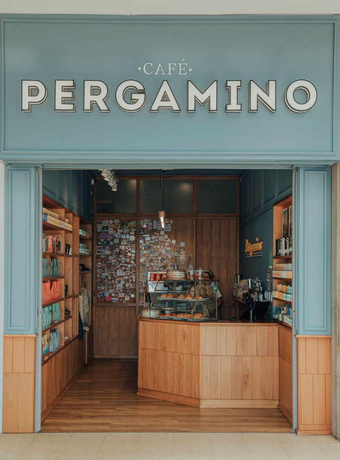 Nos encontramos en la terminal aérea en dos ubicaciones: como un oasis en el corredor principal del segundo piso, por la puerta 5 para aquellos que viajan, acompañan o que simplemente quieren pasar rápido por un café. Y en la terminal internacional, para que los que salen del país no se olviden de llevar una bolsa Pergamino.